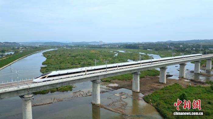 沉白高铁正线起自沉阳北站,沿线经沉阳市、抚顺市、通化市、白山市、延边朝鲜族自治州等地,终至长白山站,全长约430公里,设计时速350公里,全线日,沉白高铁模拟载客试运行列车穿过河流。(无人机照片) 夏子政 摄